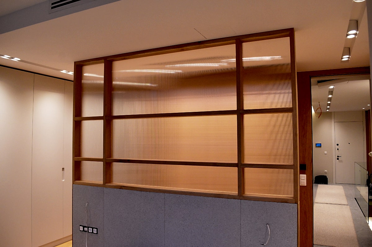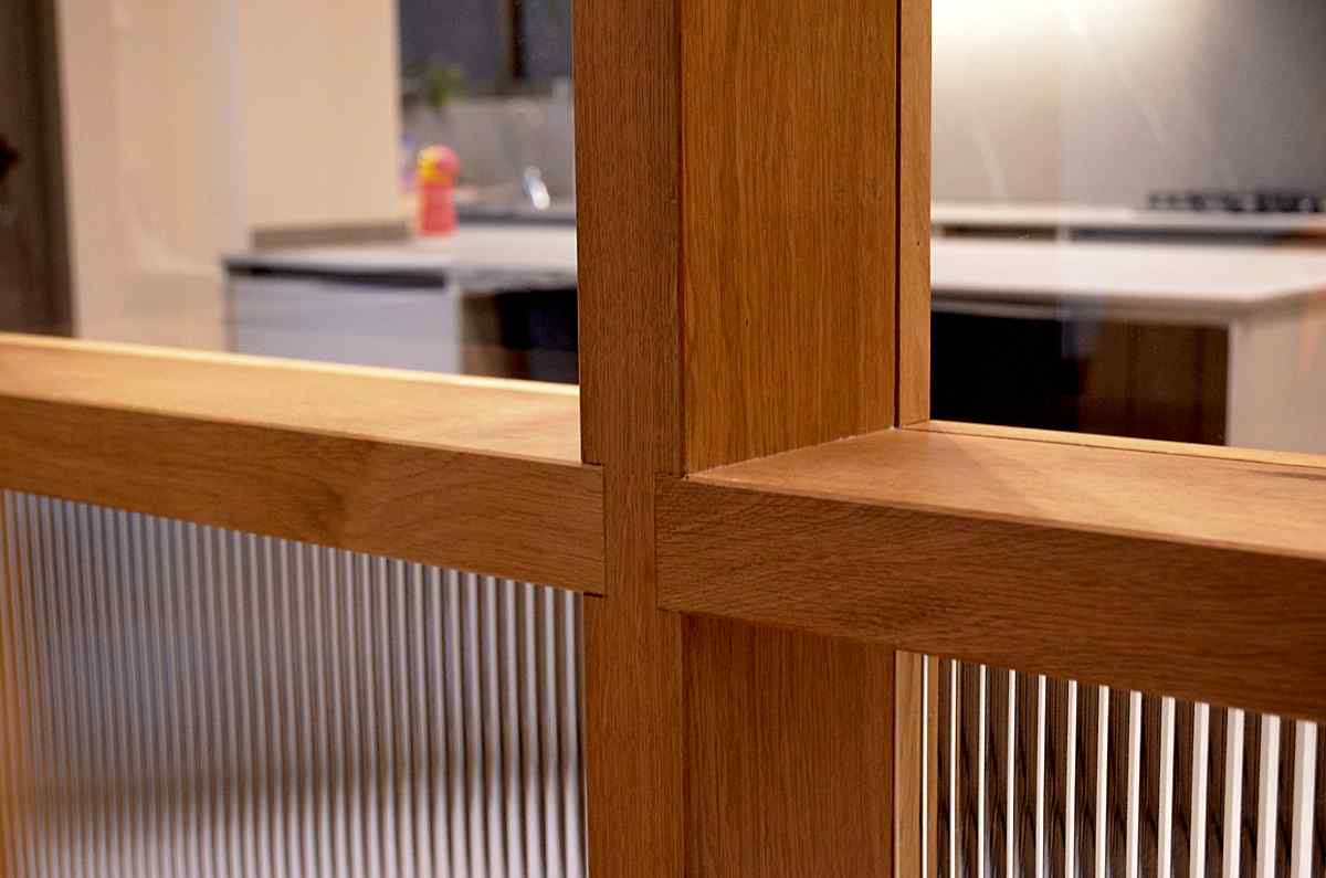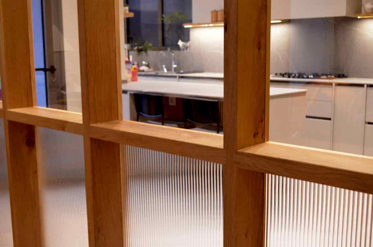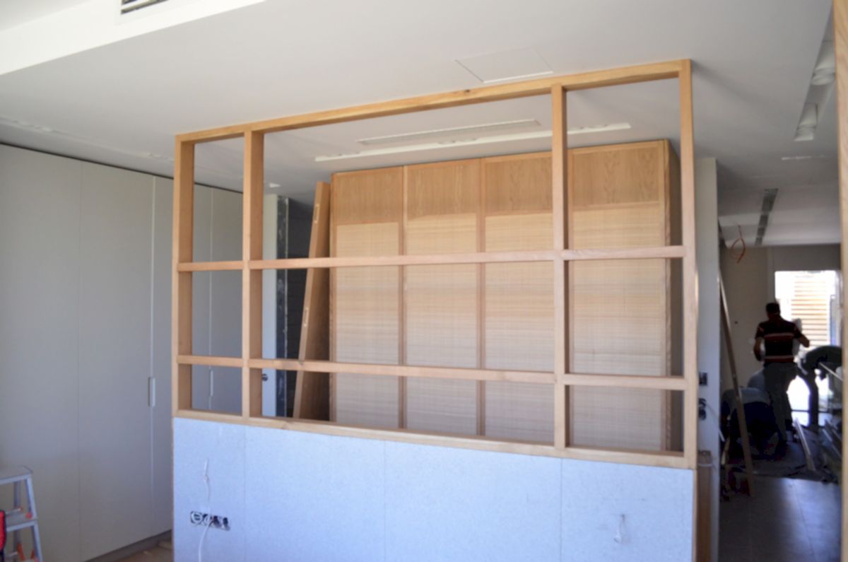 Fırın kurusu meşe ağacından ürettiğimiz biri mutfak ve salon arasında, bir diğeri ise yatak odasında gardırop ve yatak arasında ahşap seperatör görevi gören meşe doğrama ahşap tasarım uygulama.