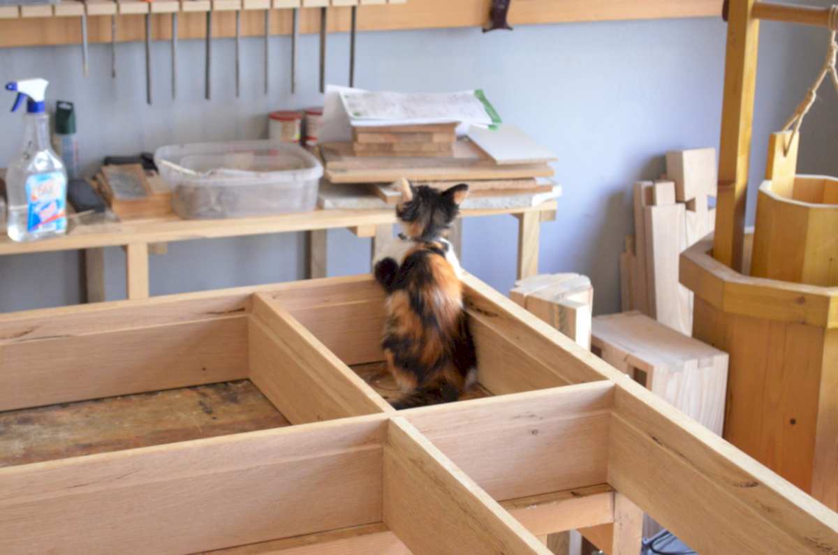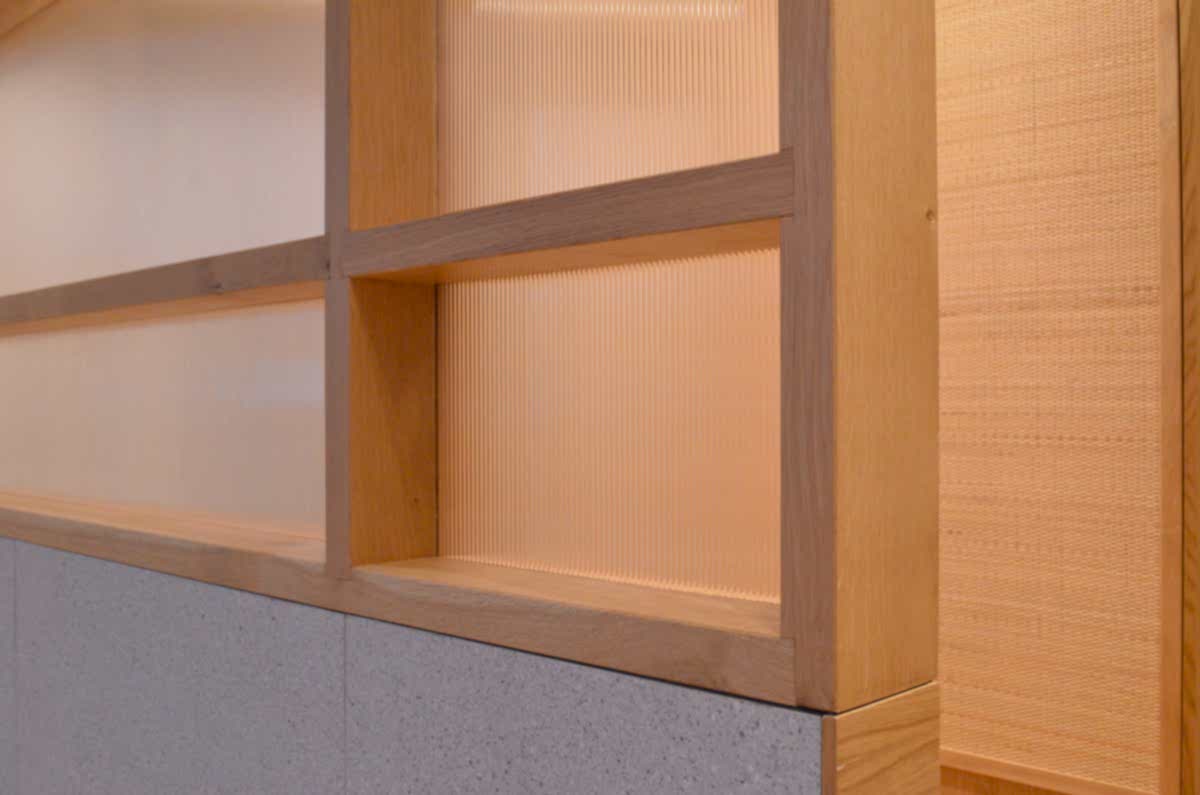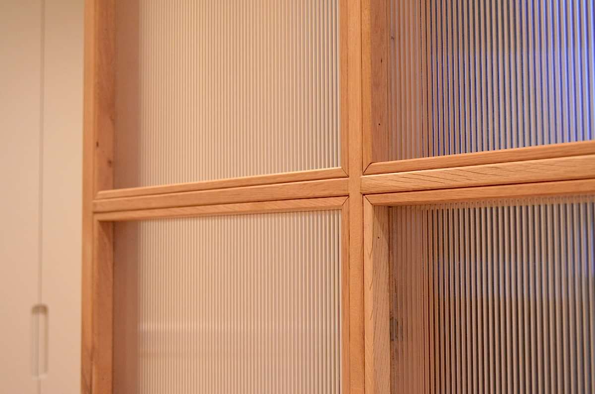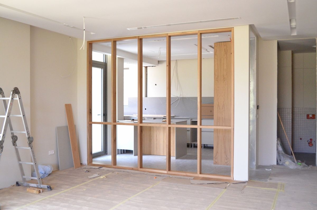 Fırın kurusu meşe ağacından ürettiğimiz biri mutfak ve salon arasında, bir diğeri ise yatak odasında gardırop ve yatak arasında ahşap seperatör görevi gören meşe doğrama ahşap tasarım uygulama.